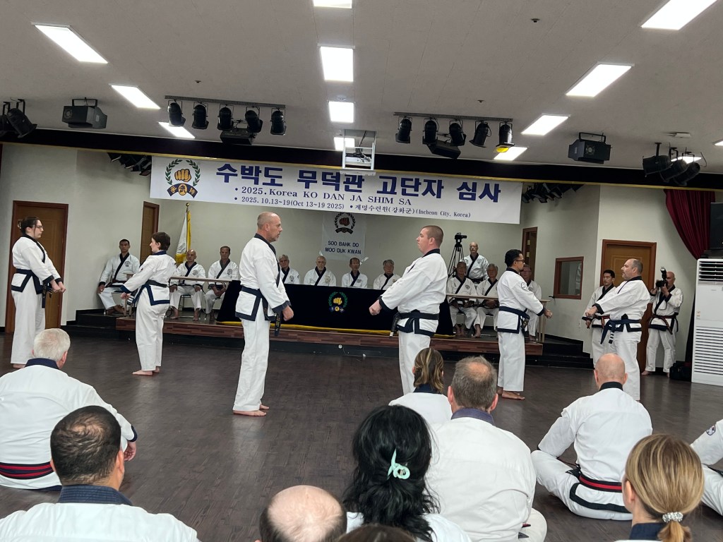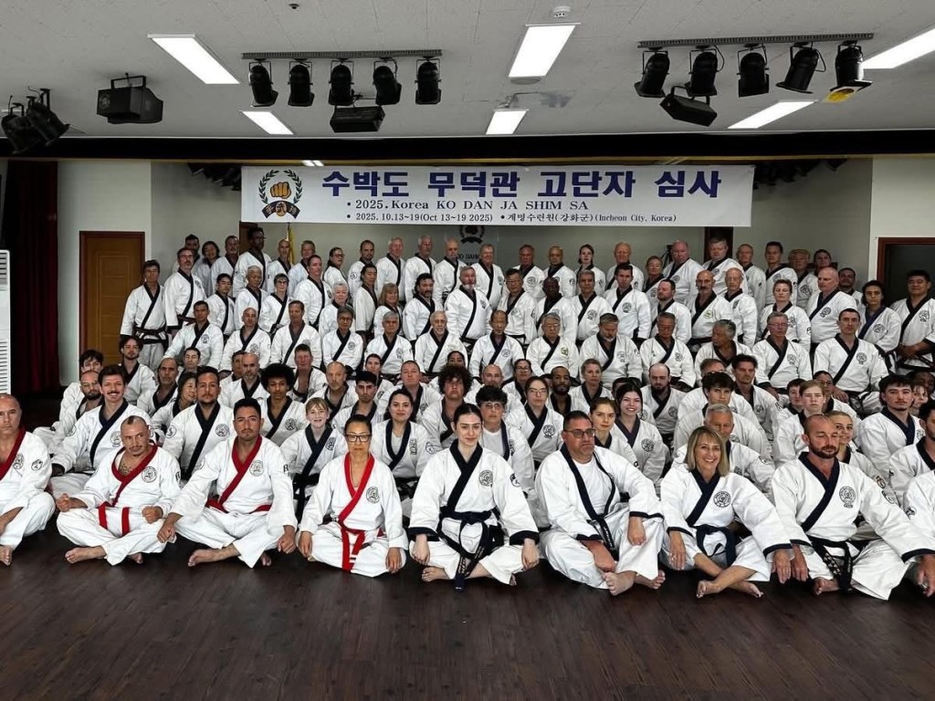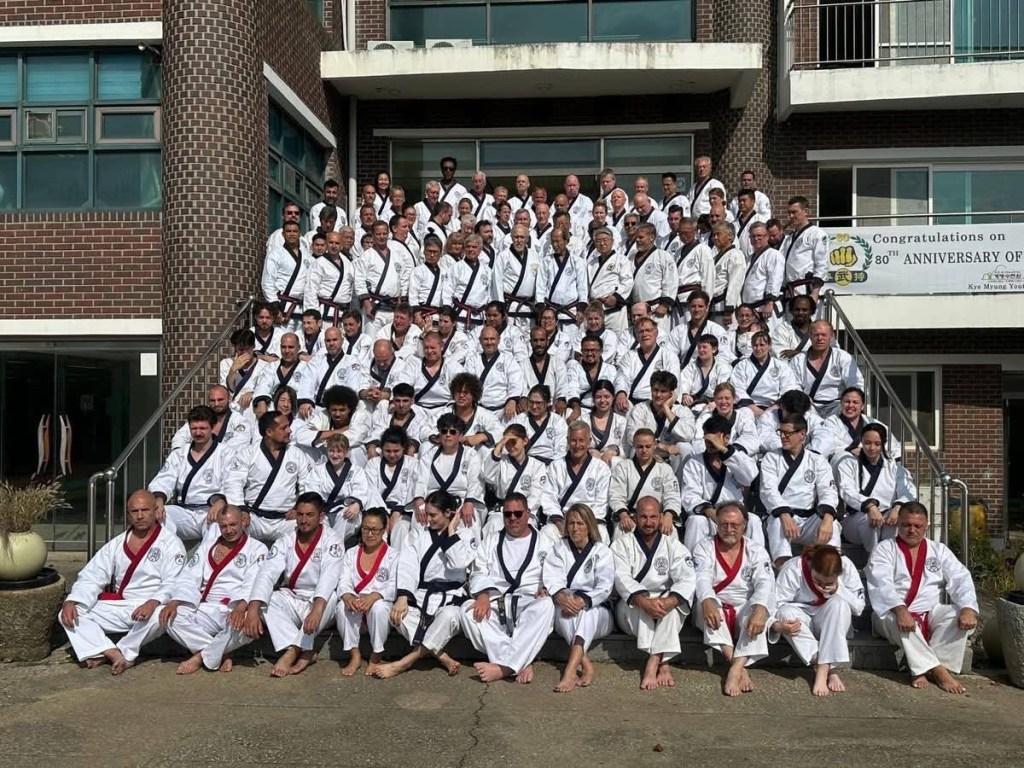 World Moo Duk Kwan was founded November 9th, 1945 in Seoul, Korea. The 80th anniversary was celebrated October 20th and 21st of 2025 and attended by 8 of our students. Two of our Sam Dan (3rd degree midnight blue belt) practitioners tested for their Sa Dan (4th degree midnight blue belt) at the Korean Shim Sa the week prior to the celebration. Below are some photos taken during the celebration of the attendees and the trip itself.